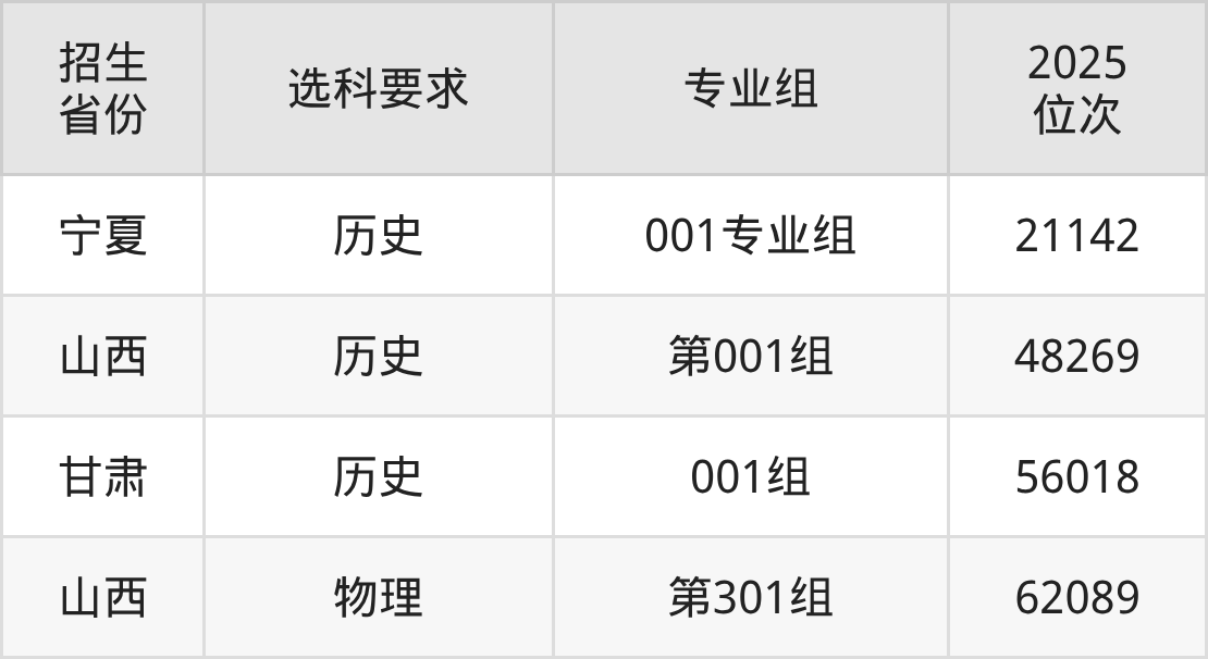 晋中师范高等专科学校2025年在全国各省的位次差异较大,最高位次是21142位(宁夏历史类)、最低位次是62089位(山西物理类)。各省具体位次请看下图: