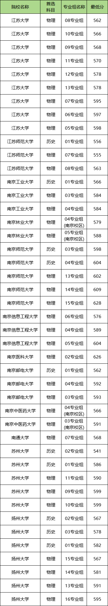在物理类中录取分最高的是南京师范大学15组,最低分628分;录取分最低的是江苏师范大学07组,最低分555分。