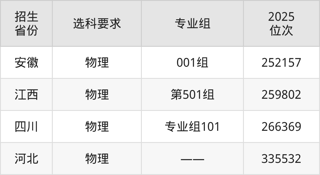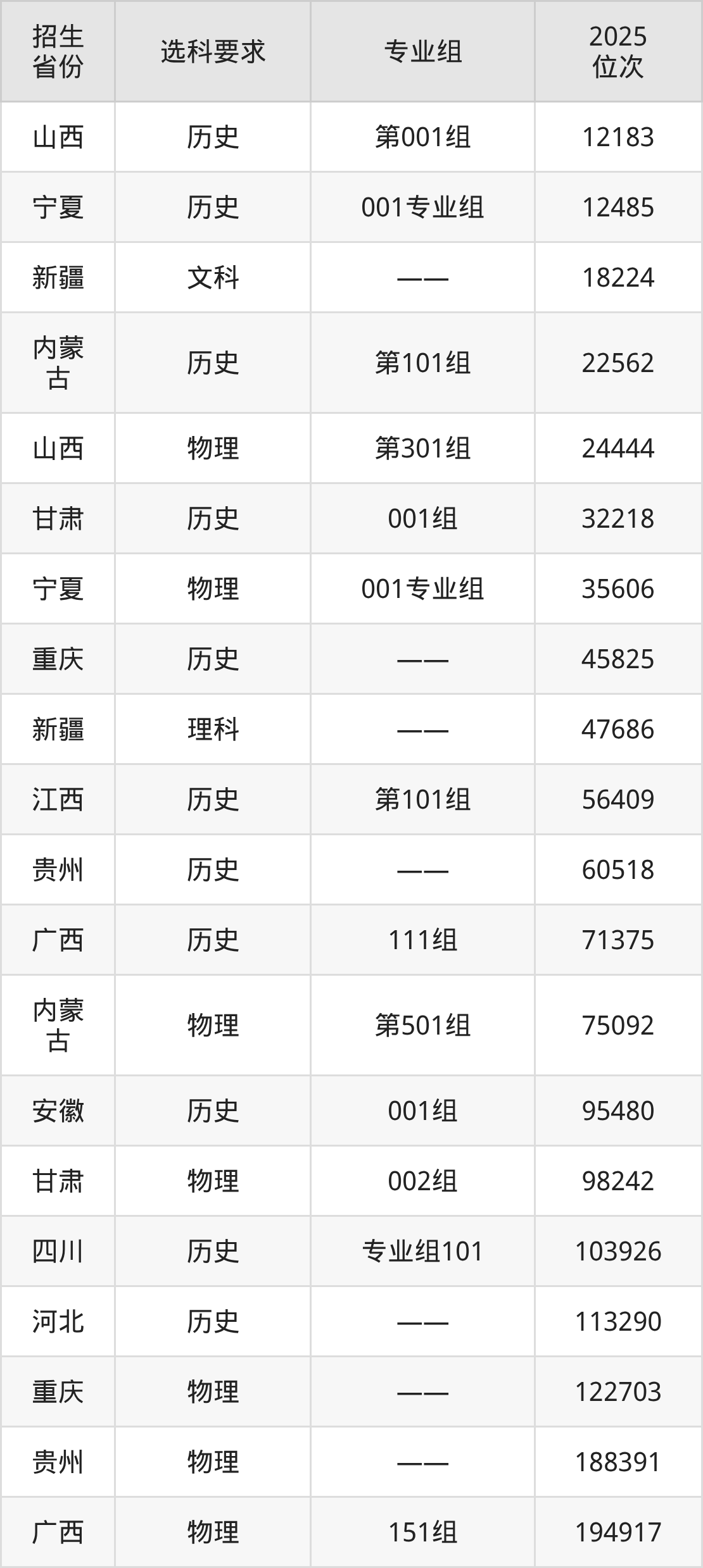 宝鸡职业技术学院2025年在全国各省的位次差异较大,最高位次是12183位(山西历史类)、最低位次是335532位(河北物理类)。各省具体位次请看下图: