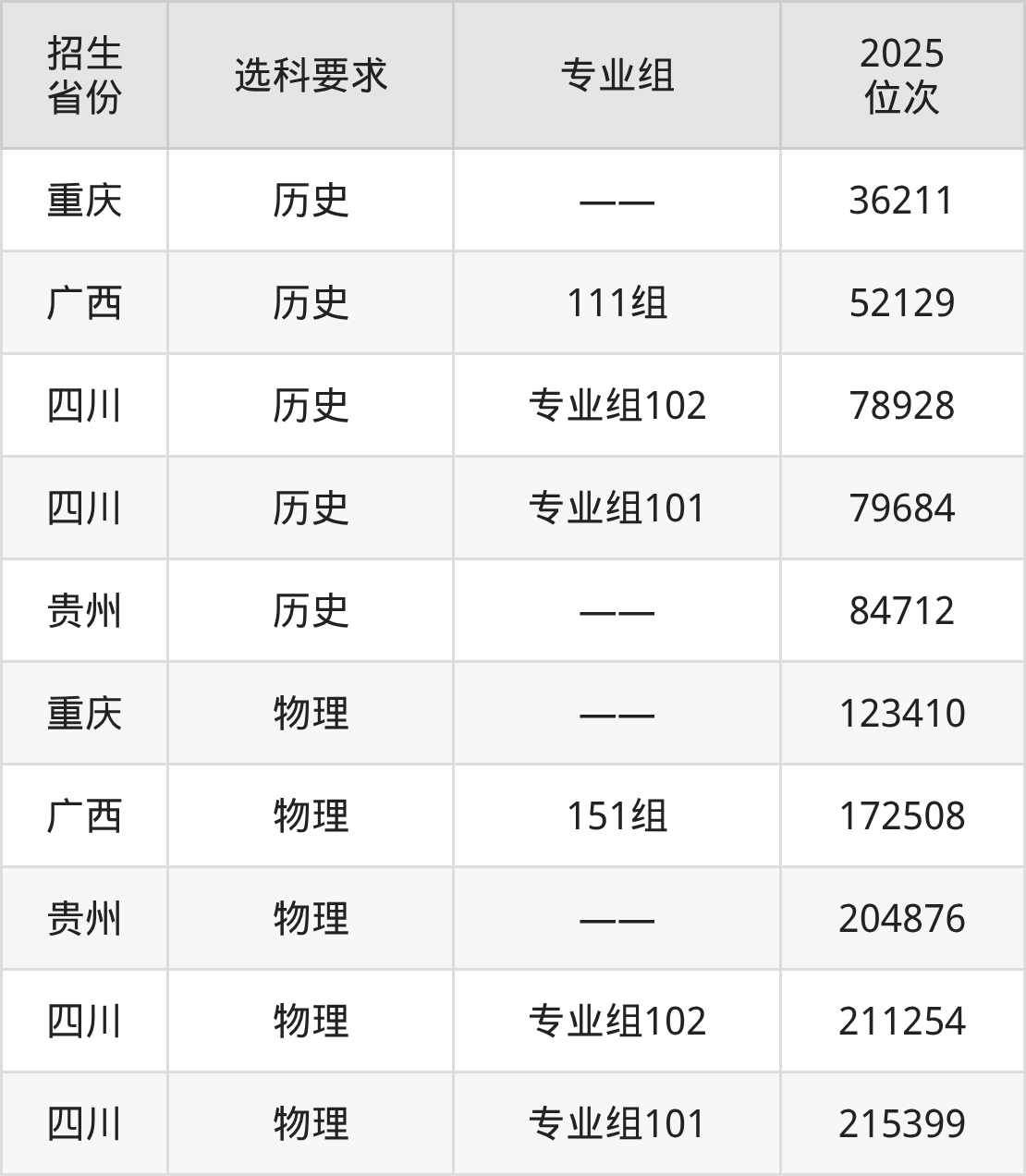 贵州农业职业学院2025年在全国各省的位次差异较大,最高位次是36211位(重庆历史类)、最低位次是215399位(四川物理类)。各省具体位次请看下图: