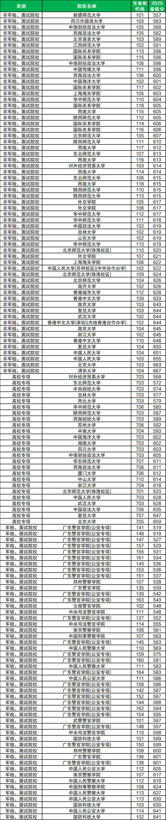 广东2025年本科提前批历史类高校专项最低分为568分(对应对外经济贸易大学703组)、军校最低分为597分(对应武警警官学院101组)、警校最低分为519分(对应广东警官学院(公安专项)141专业组)。