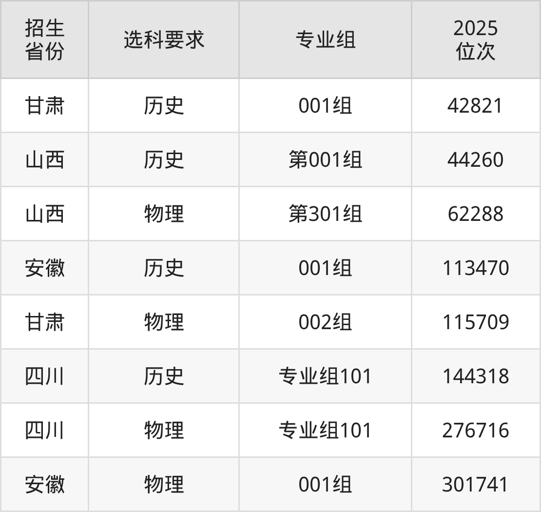 山西体育职业学院2025年在全国各省的位次差异较大,最高位次是42821位(甘肃历史类)、最低位次是301741位(安徽物理类)。各省具体位次请看下图:
