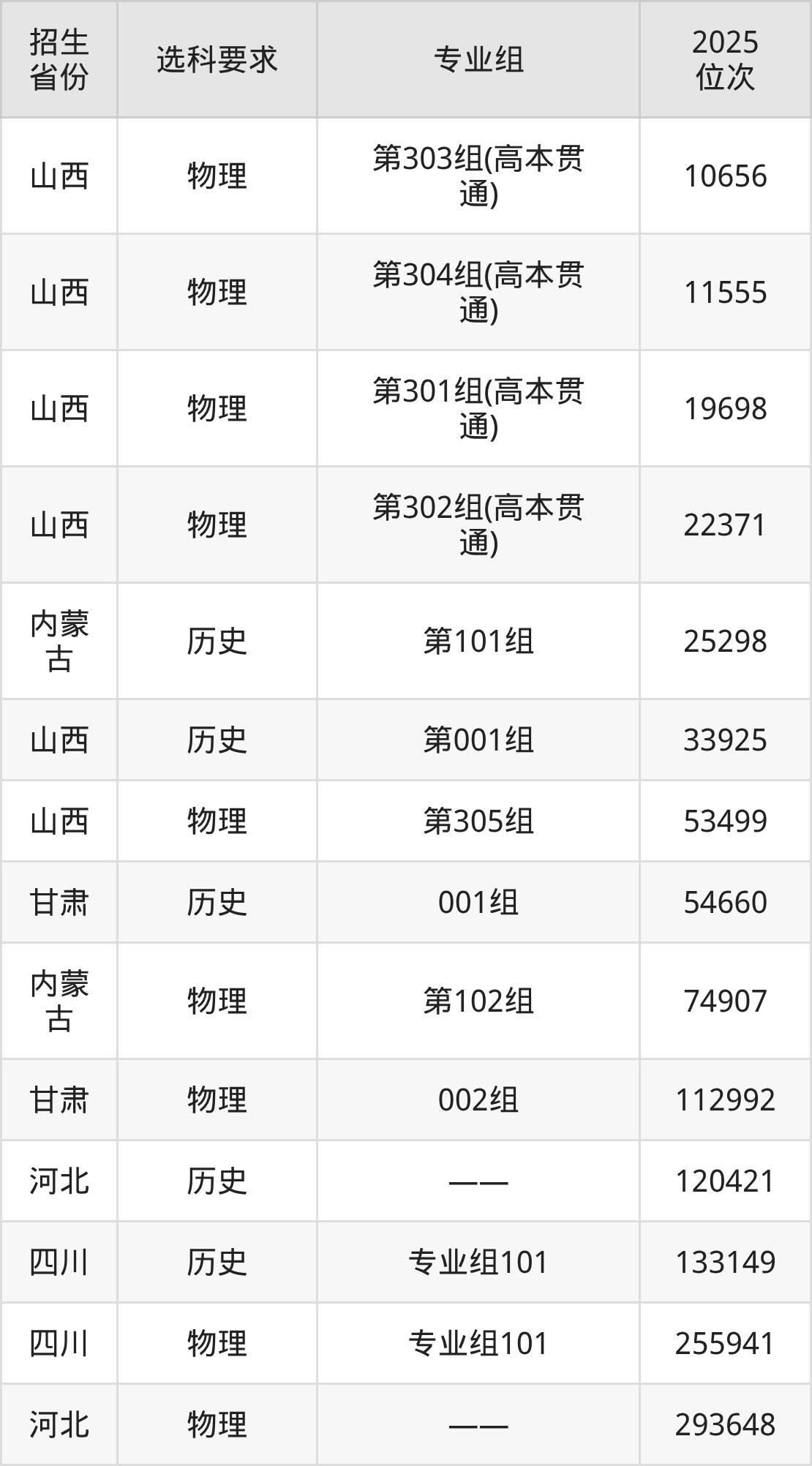 太原城市职业技术学院2025年在全国各省的位次差异较大,最高位次是10656位(山西物理类)、最低位次是293648位(河北物理类)。各省具体位次请看下图: