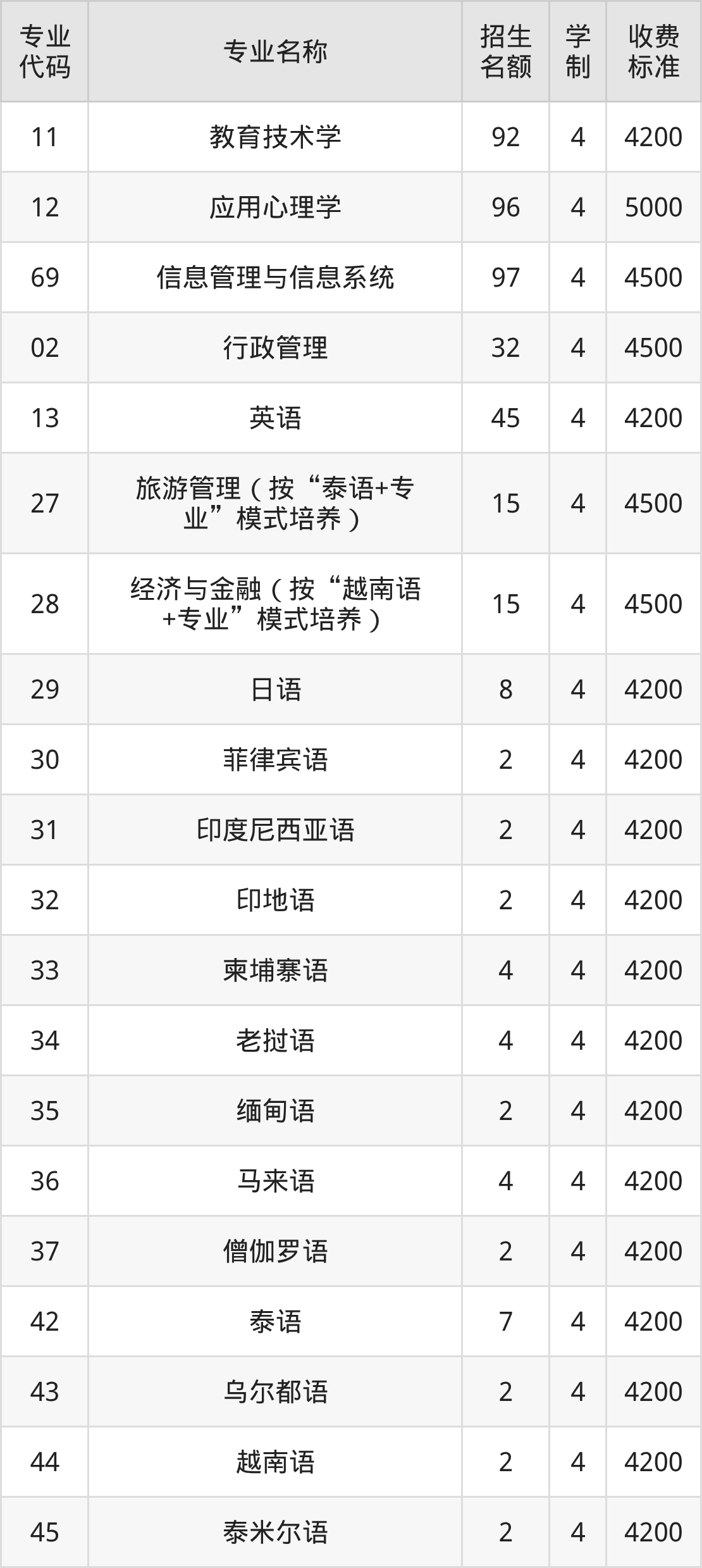 | 27 | 旅游管理(按“泰语+专 业”模式培养) | 15 | 4 | 4500 |