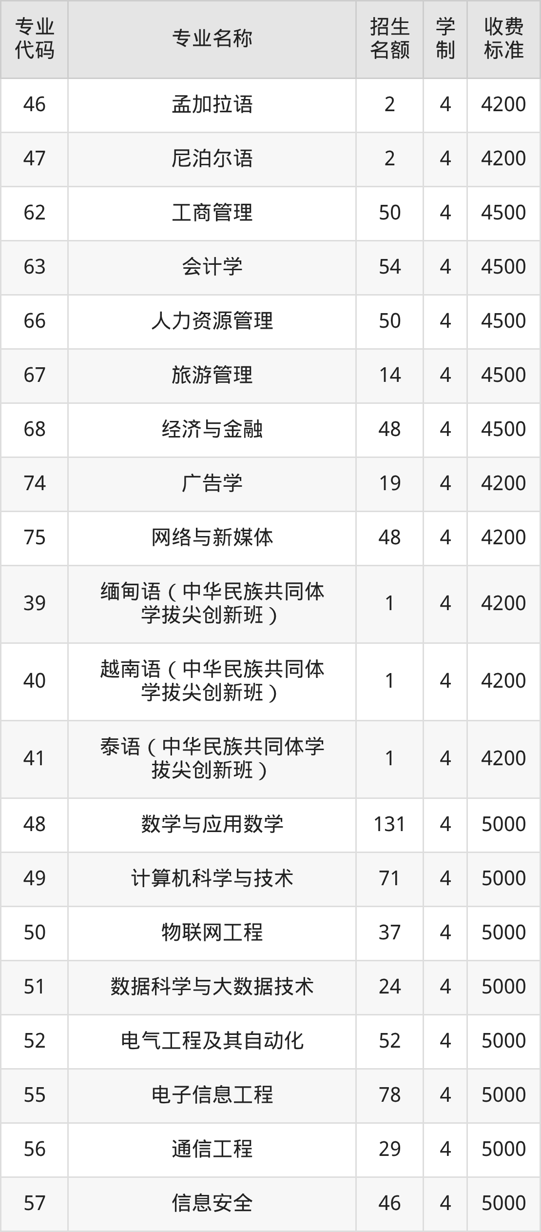 | 40 | 越南语(中华民族共同体 学拔尖创新班) | 1 | 4 | 4200 |