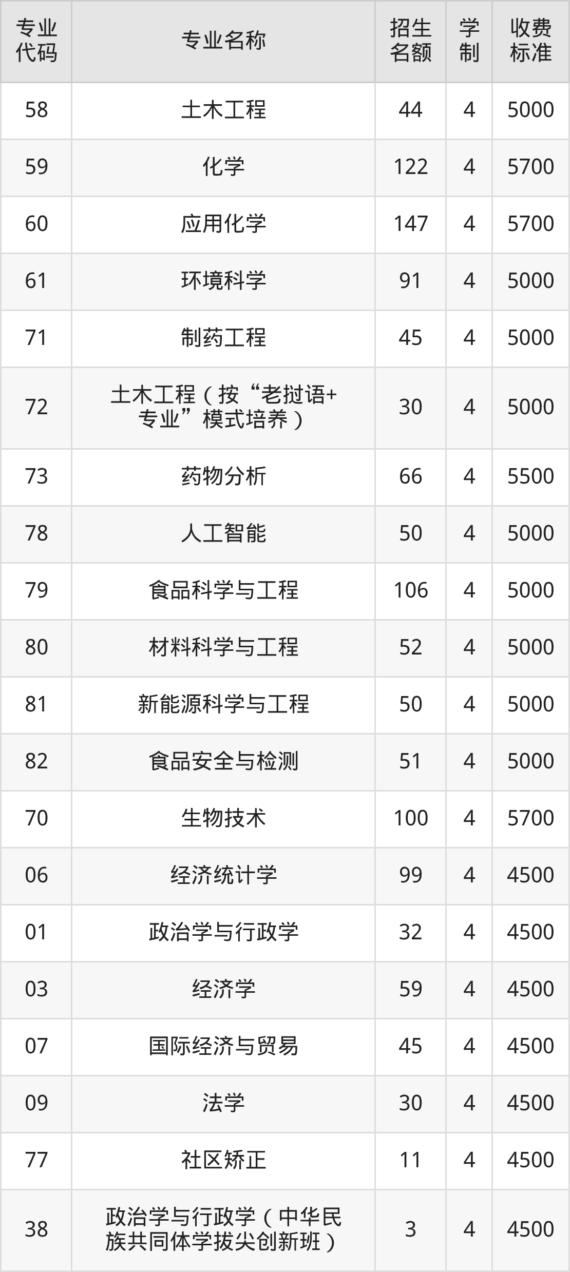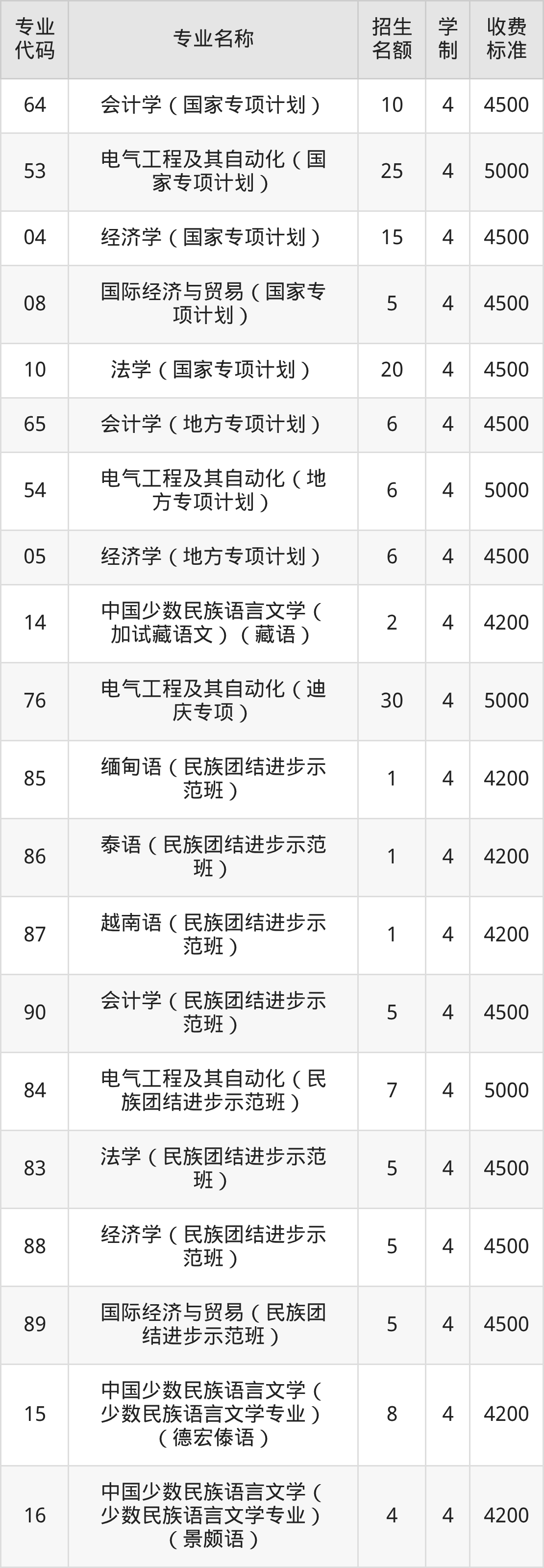 | 77 | 法学(民族团结进步示范 班) | 4 | 4 | 4500 |