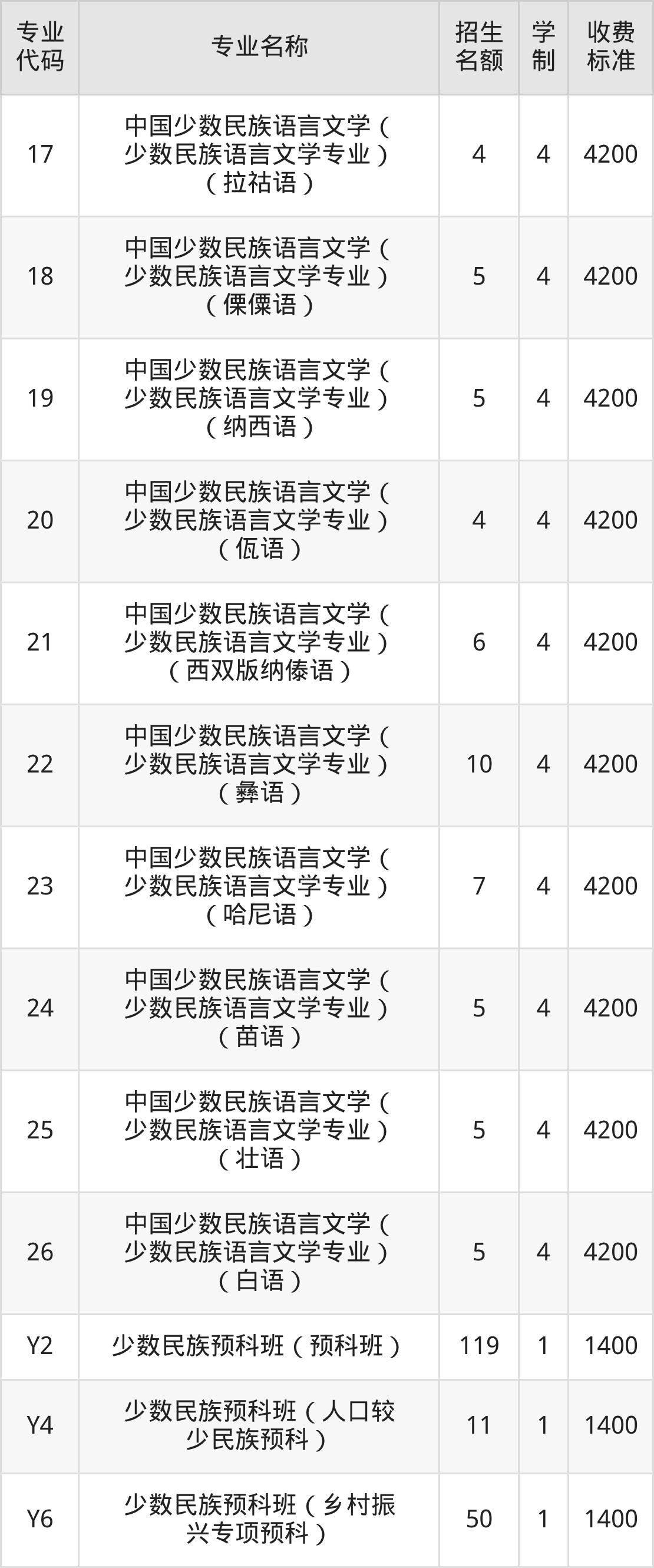 | 26 | 中国少数民族语言文学( 少数民族语言文学专业) (白语) | 15 | 4 | 4200 |