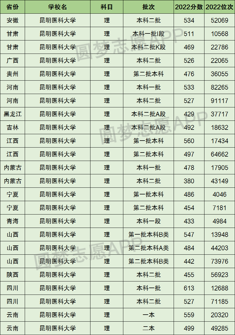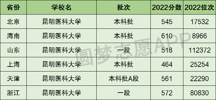 2、昆明医科大学在全国普通高考省份的【理科】招录数据,包含招生批次等信息: