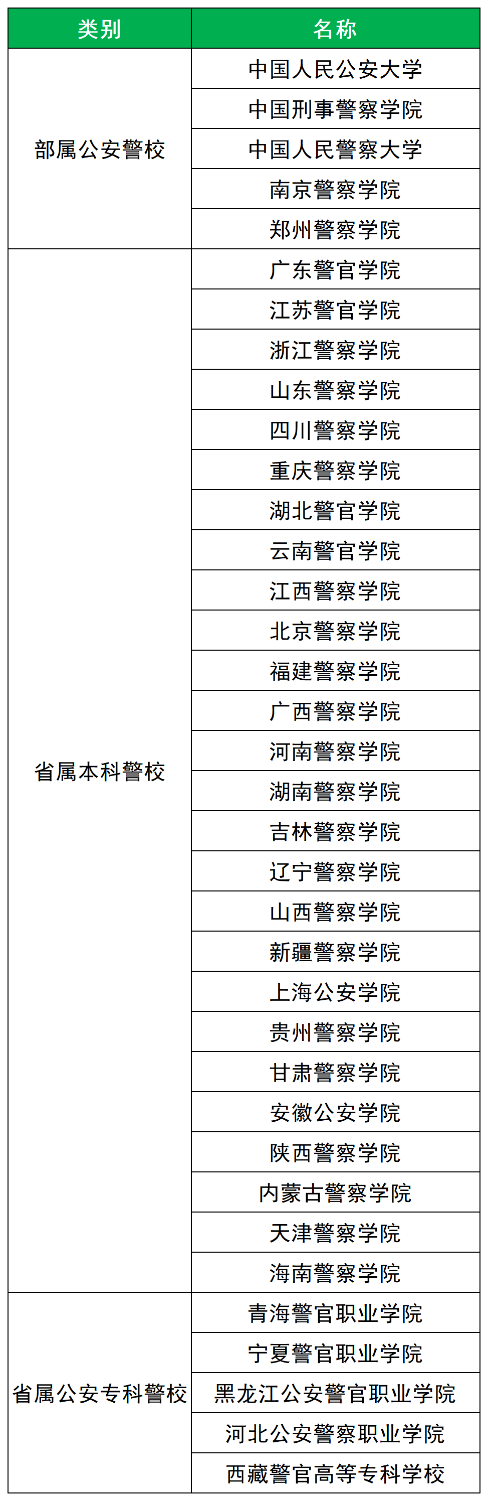 广东警官学院、江苏警官学院、浙江警察学院、山东警察学院、四川警察学院、重庆警察学院、湖北警官学院、云南警官学院、江西警察学院、北京警察学院、福建警察学院、广西警察学院、河南警察学院、湖南警察学院、吉林警察学院、辽宁警察学院、山西警察学院、新疆警察学院、上海公安学院、贵州警察学院、甘肃警察学院、安徽公安学院、陕西警察学院、内蒙古警察学院、天津警察学院、海南警察学院。