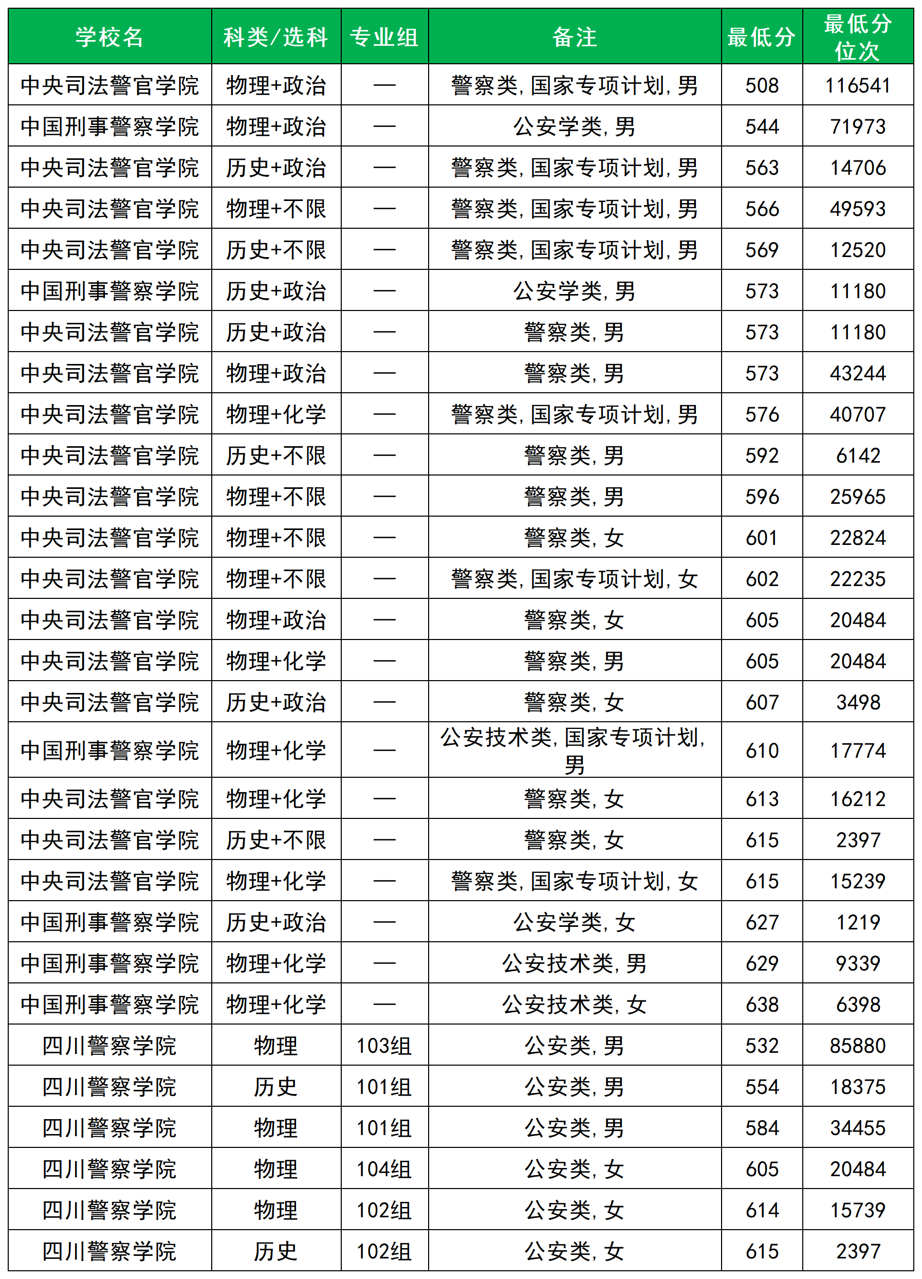历史类:四川警察学院在男生中最低录取分为554分,女生最低615分;中国刑事警察学院在男生中最低录取分为573分,女生最低625分。