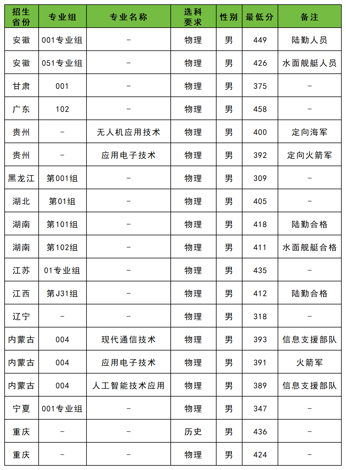 下面是重庆航天职业技术学院2025年在全国各省定向士官招生分数线一览表,供参考: