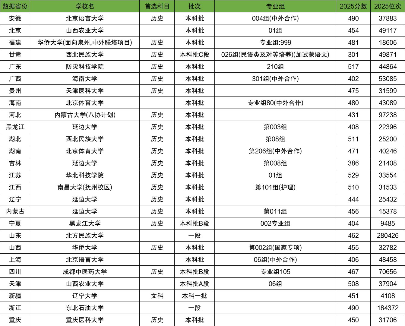 下面是文科2025年全国各省分数最低的公办一本名单(虽然新高考省份不区分一本、二本,但为让更多省份考生了解相应层次大学的分数线,下表也汇总了本科批含“双一流、中央部署、国家重点”标签的最低分大学名单):