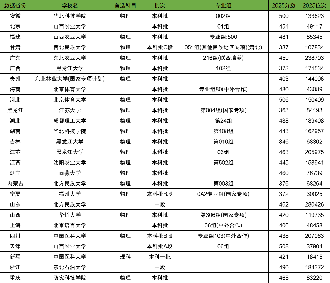 而分数要求最高的地区是天津,2025年天津考生至少要508分才能上公办一本,可上的大学为山西农业大学。