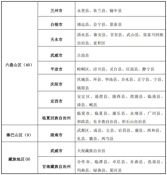 2026甘肃国家专项计划实施区域涵盖11个市州(原集中连片贫困县)共58个县(市、区),包括兰州市永登县、皋兰县;白银市会宁县、景泰县;武威市古浪县、天祝藏族自治县等,具体实施区域名单如下: