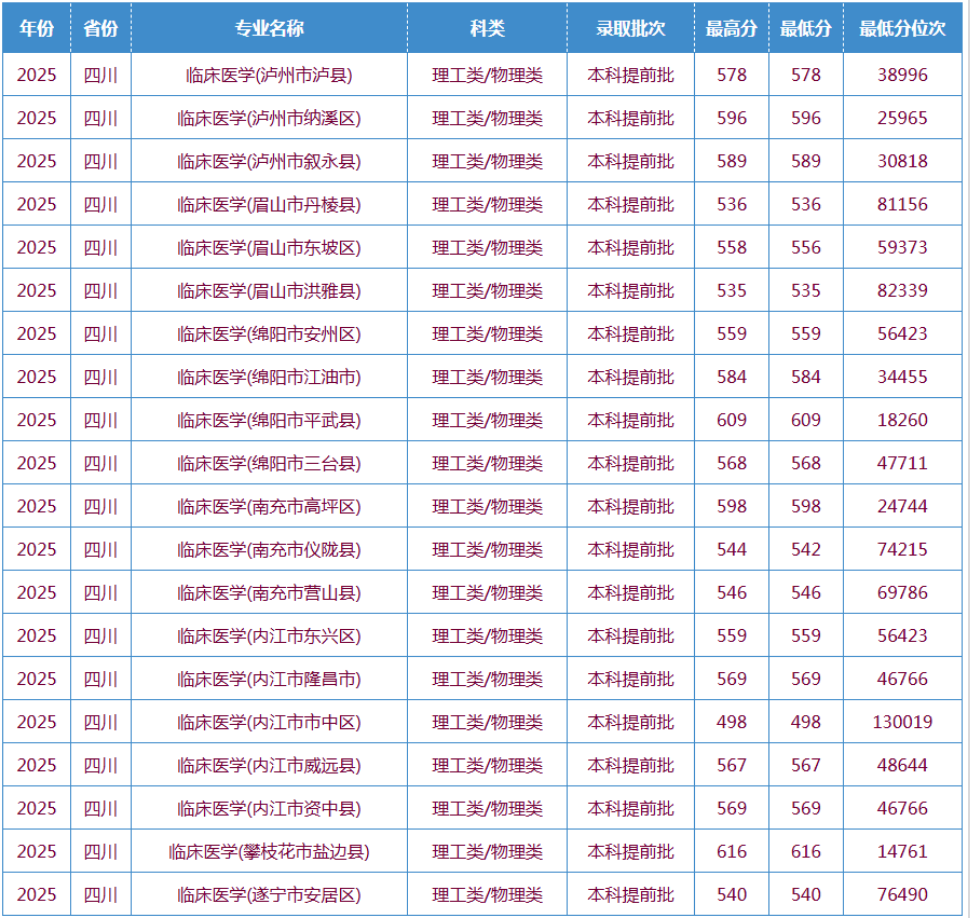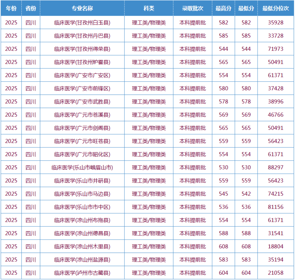 2025年四川定向医学生院校录取分数线最低分:西南医科大学462分、川北医学院485分、成都中医药大学437分、成都医学院426分。
