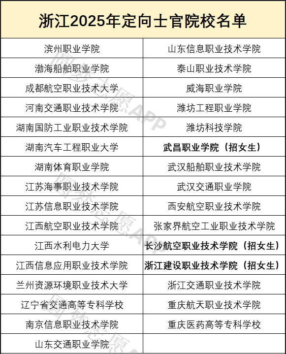 最新一年招生计划显示,定向士官在浙江省招生院校共计31所,不同院校招生人数、专业、类型等都有差异,为方便2026届考生报考,下面将详细列举这些学校的名单,供查阅: