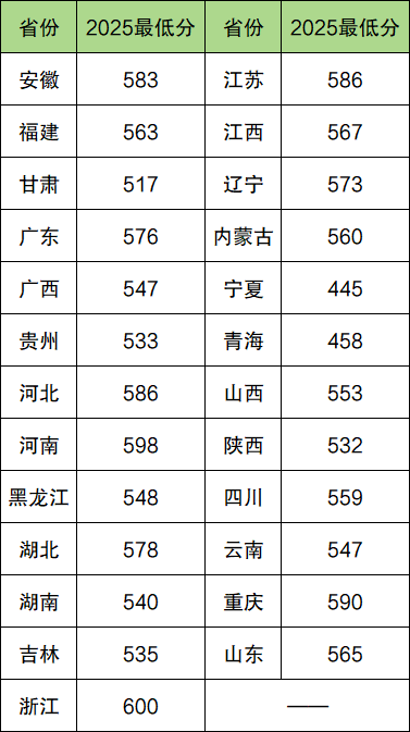 | 招生省份 | 2025最低分 |