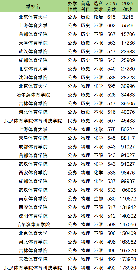 此外分数较高的还有首都体育学院,2025最低分历史组567分、物理组543分;武汉体育学院,历史组547分、物理组543分;天津体育学院,历史组563分、物理组545分;南京体育学院,物理组530分。