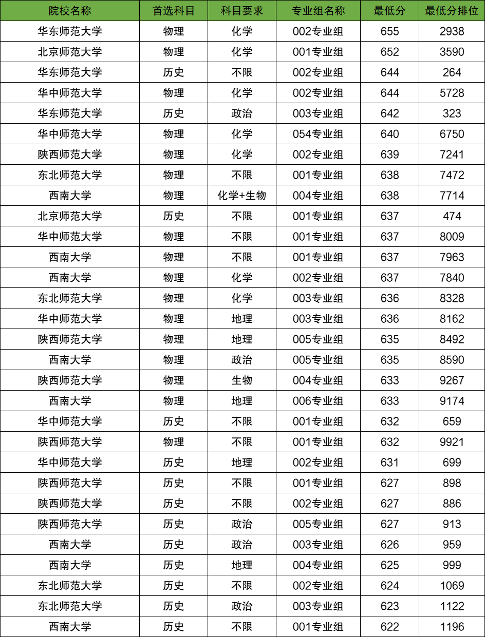 安徽公费师范生院校专业组中物理类录取分数线最低的是陕西师范大学001专业组,2025年的最低分数线为632分,最低位次9921位。