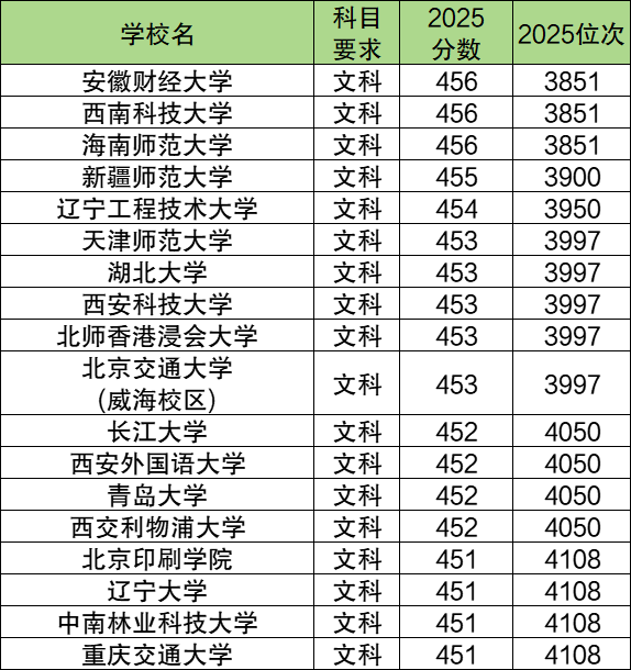 2025年新疆文科本科一批线附近(448分到456分)能上的本科院校一共有14个,排名靠前的有安徽财经大学(3851名)、西南科技大学(3851名)、海南师范大学(3851名)等,这些属于本科一批线附近考生可以冲一冲的学校。