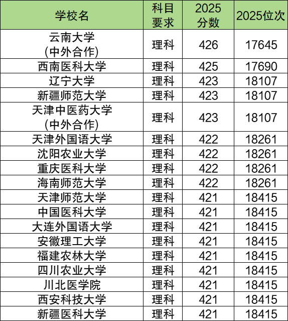 本科一批线附近能上的211大学:云南大学(中外合作)为426分;辽宁大学为423分;四川农业大学为421分。