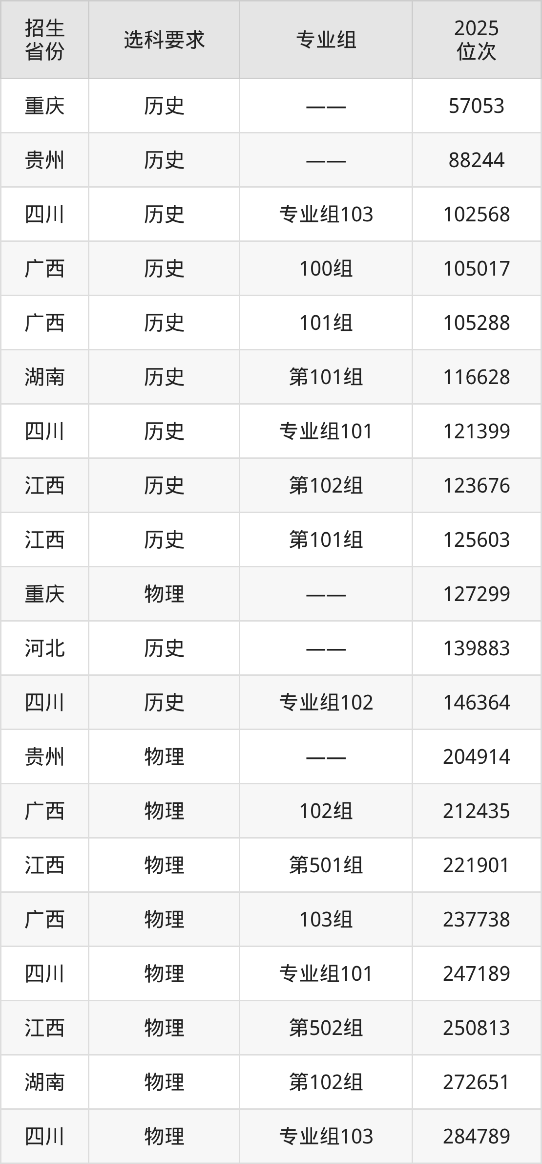 黔南民族职业技术学院2025年在全国各省的位次差异较大,最高位次是57053位(重庆历史类)、最低位次是322236位(河北物理类)。各省具体位次请看下图: