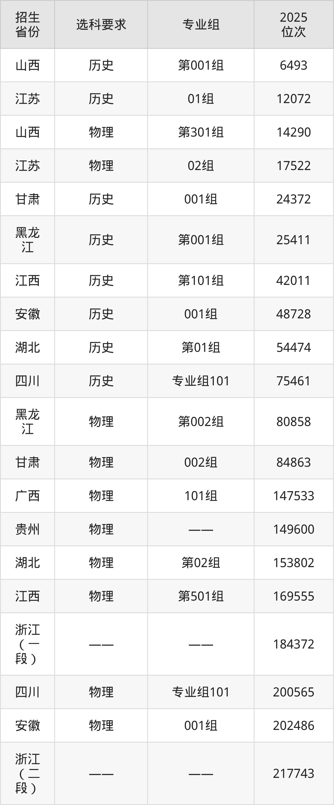 浙江邮电职业技术学院2025年在全国各省的位次差异较大,最高位次是6493位(山西历史类)、最低位次是249677位(广东物理类)。各省具体位次请看下图: