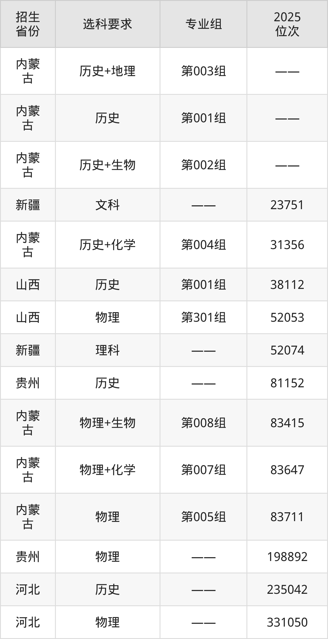 乌兰察布职业学院2025年在全国各省的位次差异较大,最高位次是23751位(新疆文科)、最低位次是331050位(河北物理类)。各省具体位次请看下图: