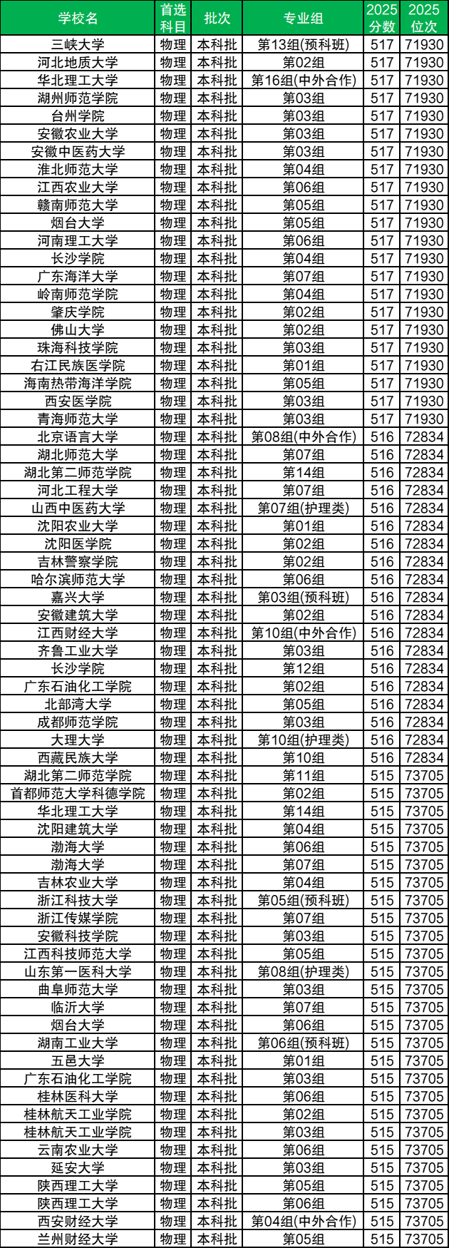 物理类:2025年特控线为516分,对应最低省排名72834名;
