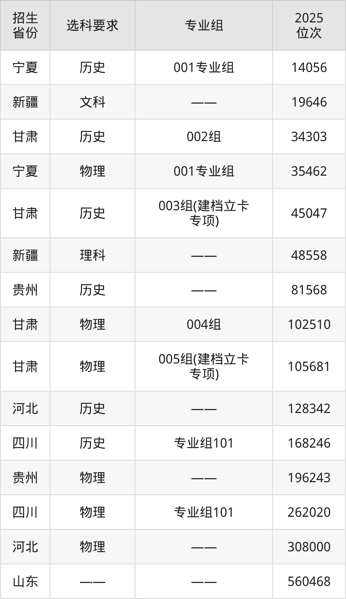 兰州职业技术学院2025年在全国各省的位次差异较大,最高位次是14056位(宁夏历史类)、最低位次是560468位(山东)。各省具体位次请看下图:
