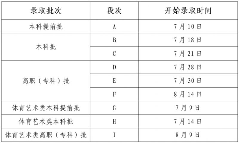 本科提前批A段:录取开始时间7月11日,结束时间7月15日;