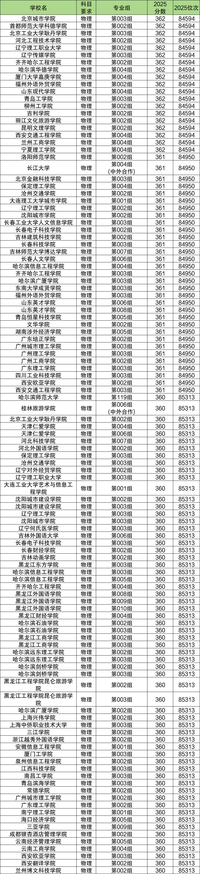2025年黑龙江物理类本科批分数线附近(360分到362分)能上的本科院校一共有86个,排名靠前的有北京城市学院(第003组,84594名)、首都师范大学科德学院(第002组,84594名)、北京工业大学耿丹学院(第003组,84594名)等,这些属于本科批分数线附近考生可以冲一冲的学校。