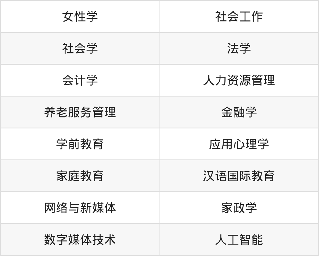 根据2025年北京高考招生计划可知,中华女子学院招生专业包含女性学、社会工作、社会学等,完整版名单如下。