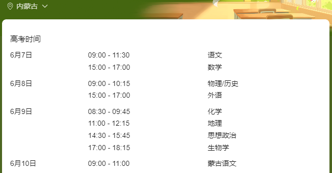 注:四川有原“少数民族语言授课为主”学生和“加授少数民族语文”学生参加高考,这部分学生除参加全国统考科目和选择考科目考试外还须参加本类别的民族语文科目考试,考试时间分别安排在6月10日的9:00—11:30、9:00—11:00。)
