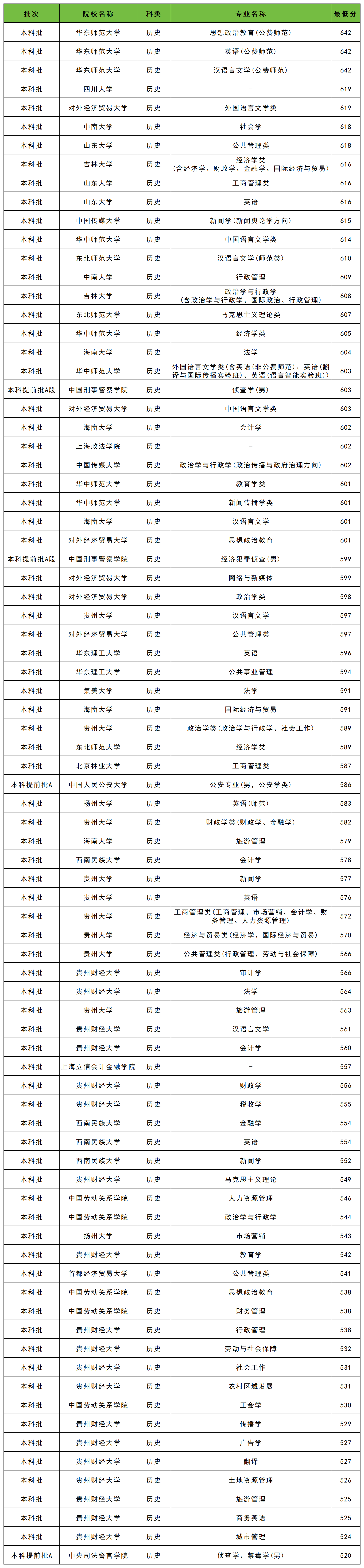 2025年贵州国家专项历史类录取分数线位于520分到642分之间,各学校各专业最低分如下。