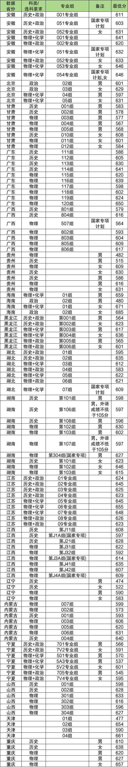 中国人民公安大学历史类:001专业组611分、051组(国家专项)603分、052组(女)631分;