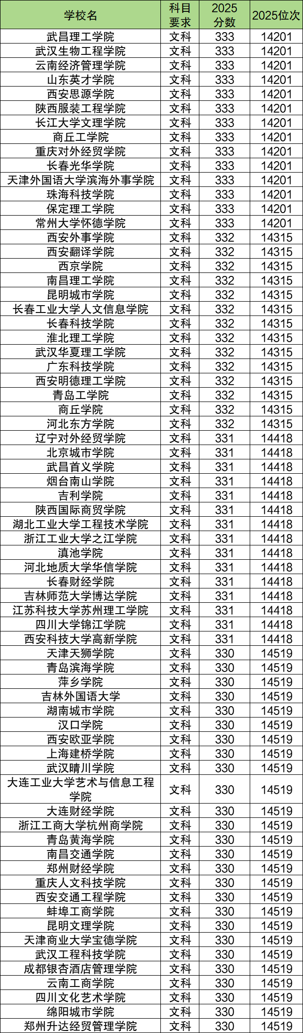 2025年新疆文科本科二批线附近(330分到333分)能上的本科院校一共有69个,排名靠前的有武昌理工学院(14201名)、武汉生物工程学院(14201名)、云南经济管理学院(14201名)等,这些属于本科二批线附近考生可以冲一冲的学校。