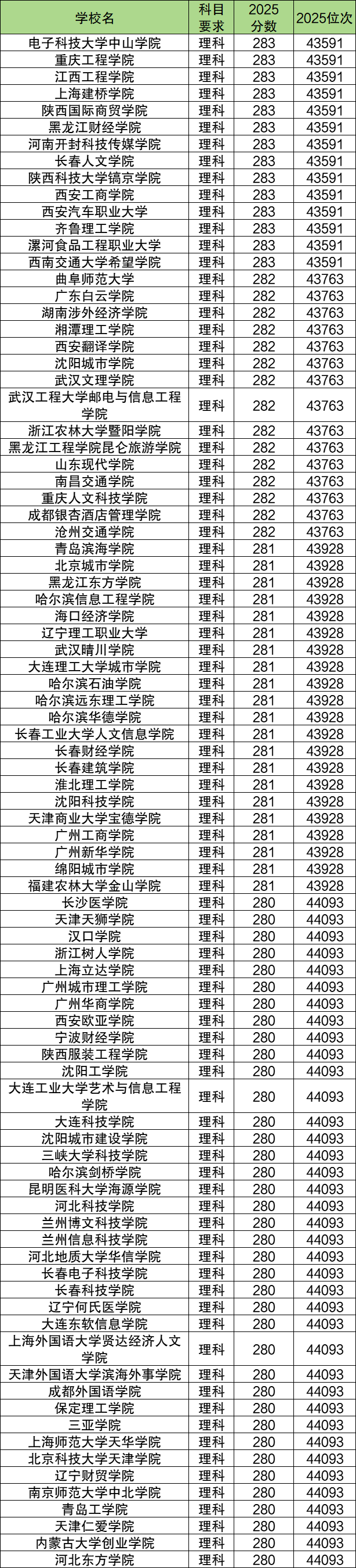 2025年新疆理科本科二批线附近(280分到283分)能上的本科院校一共有88个,排名靠前的有电子科技大学中山学院(43591名)、重庆工程学院(43591名)、江西工程学院(43591名)等,这些属于本科二批线附近考生可以冲一冲的学校。