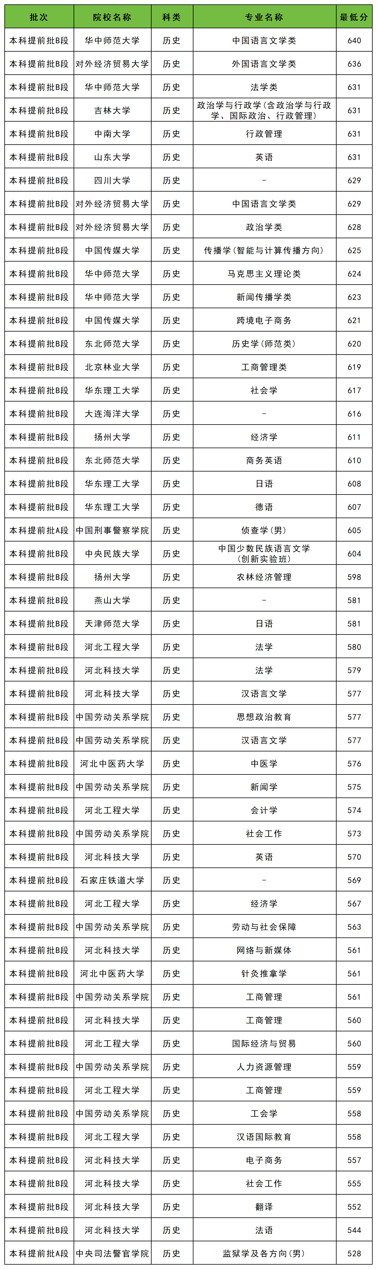 2025年河北国家专项历史类录取分数线位于528分到640分之间,各学校各专业最低分如下。