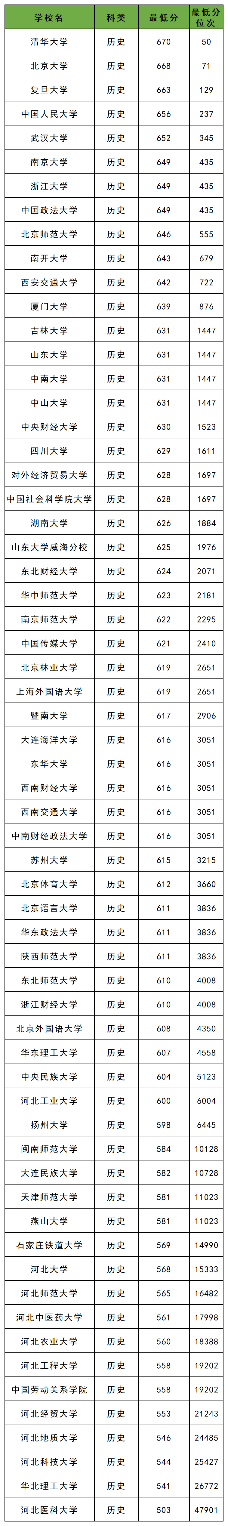 2025年河北国家专项历史类录取分数线位于503分到670分之间,各学校最低分如下。