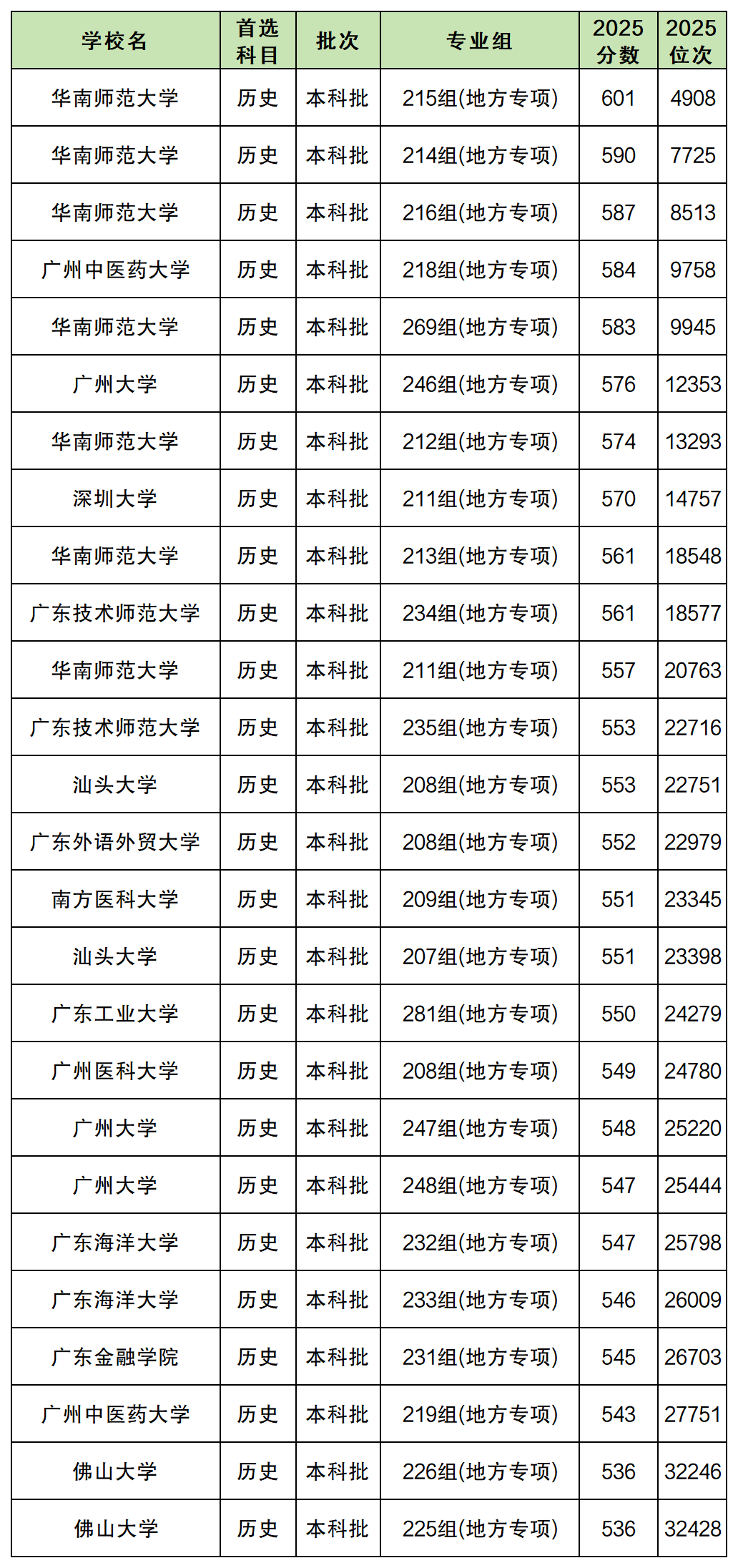 以下是2025年各大学地方专项计划在广东历史类的录取分数线一览表: