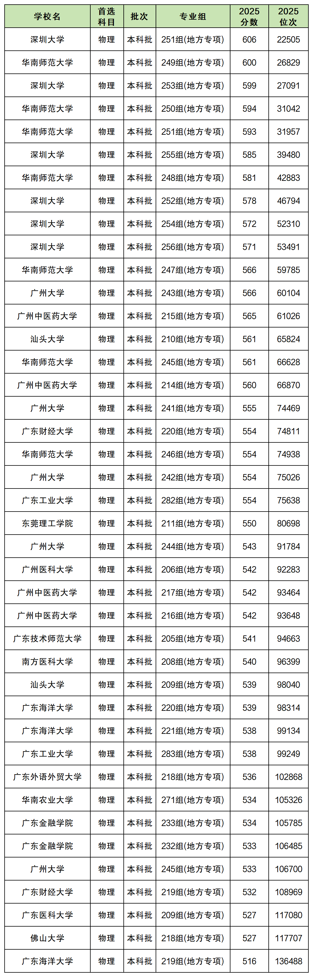 2025年各大学地方专项计划在广东物理类的招生专业组要多于历史类,物理类各大学地方专项计划各专业组的录取分数线在516分-606分之间;录取分数最高的是深圳大学251组(地方专项),最低分为606分;录取分数最低的是广东海洋大学219组(地方专项),2025最低分为516分。