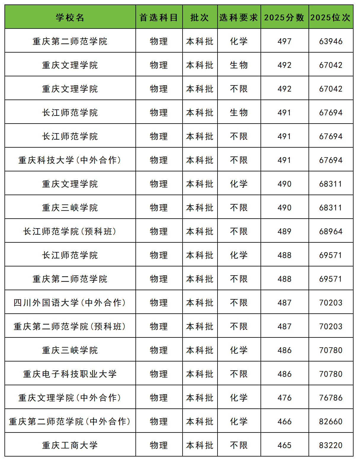 2025年重庆物理类公办二本大学录取分数线从465分到497分之间,对应最低排位从83220名到63946名。