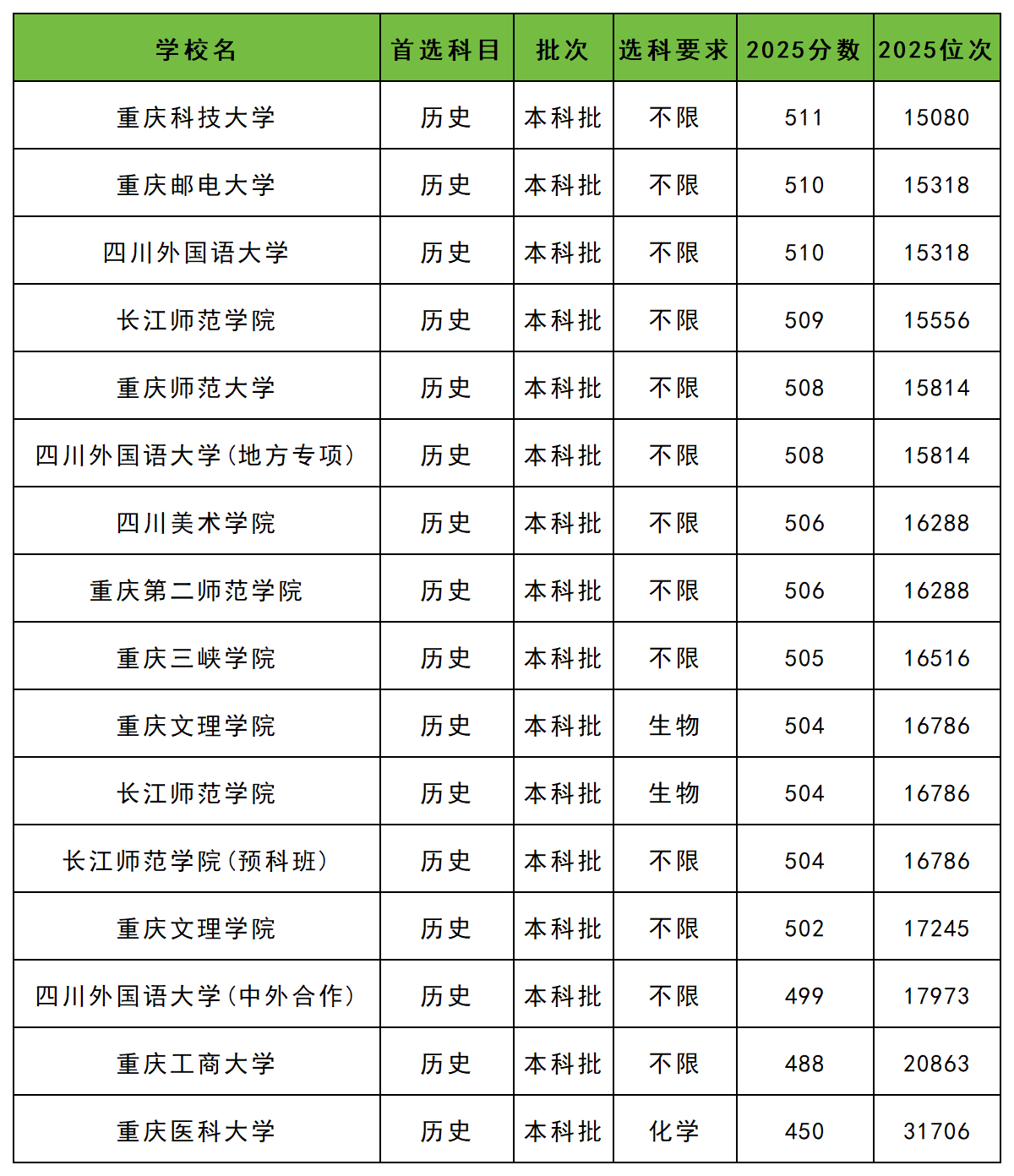 2025年重庆历史类公办二本大学录取分数线从450分到511分之间,对应最低排位从31706名到15080名。