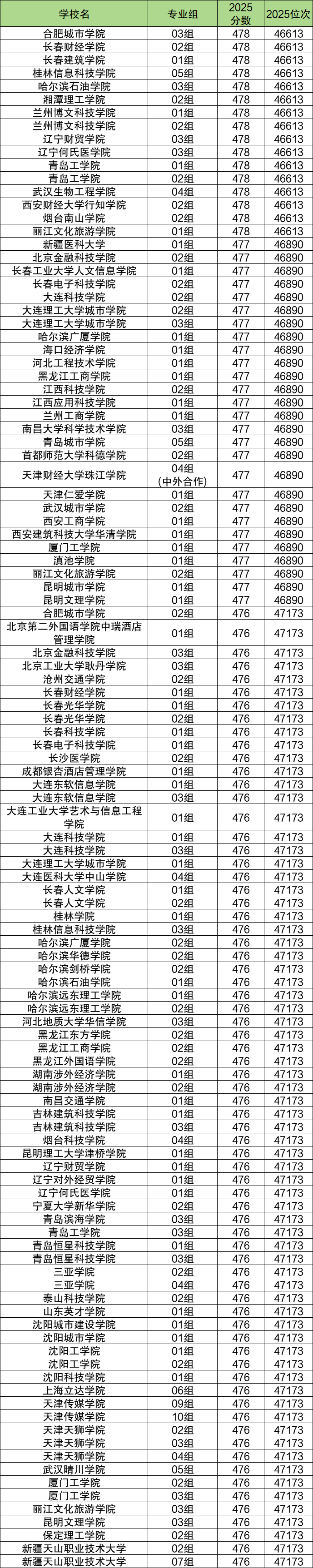 排名稍低的有昆明文理学院(03组,47173名)、保定理工学院(02组,47173名)、新疆天山职业技术大学(02组、07组,均为476分)等,这些属于本科线附近比较稳妥能上的大学。