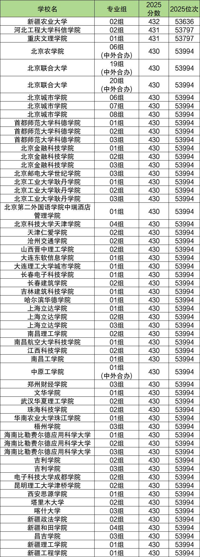 2025年北京本科线附近(430分到432分)能上的本科院校一共有45个,排名靠前的有新疆农业大学(02组,53636名)、河北工程大学科信学院(02组,53797名)、重庆文理学院(01组,53797名)等,这些属于本科线附近考生可以冲一冲的学校。