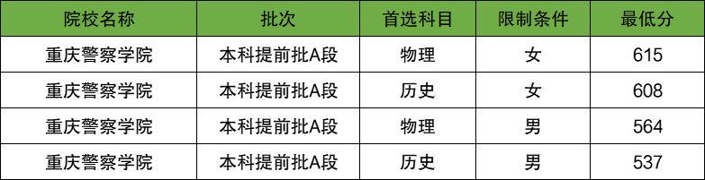 重庆警察学院是我国公安类警校,2025年在重庆提前批招生录取分数线如下:公安类专业男生最低分537分、女生最低分608分。