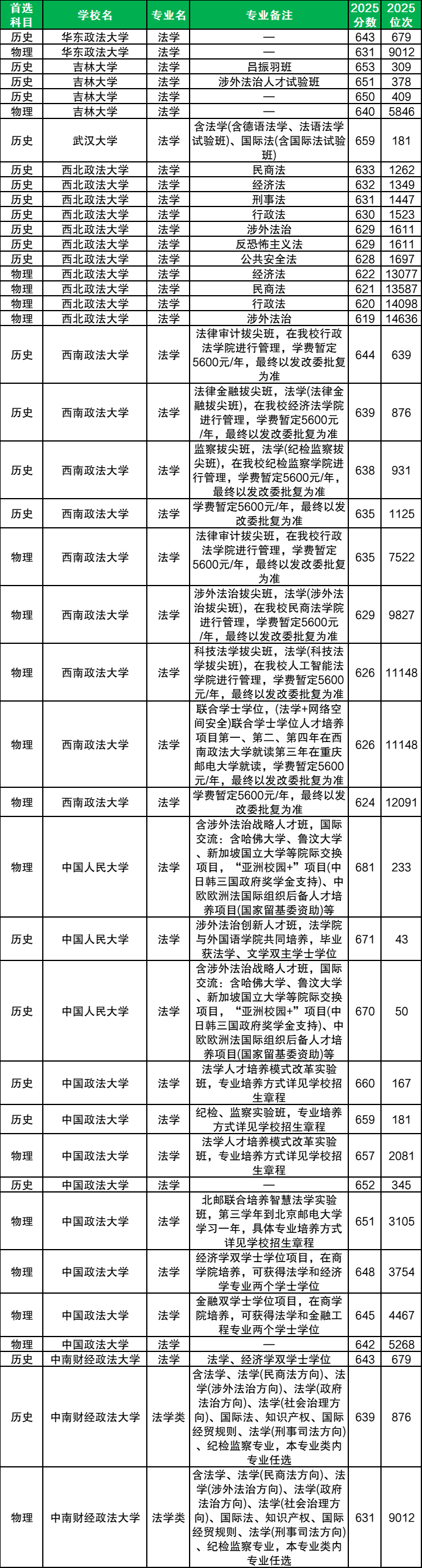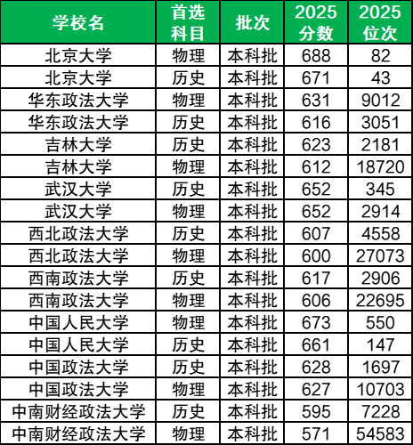 院校最低分只是这些大学的最低招生门槛,热门或王牌专业分数会更高。以五院四系的法学专业在河北招生数据为例: