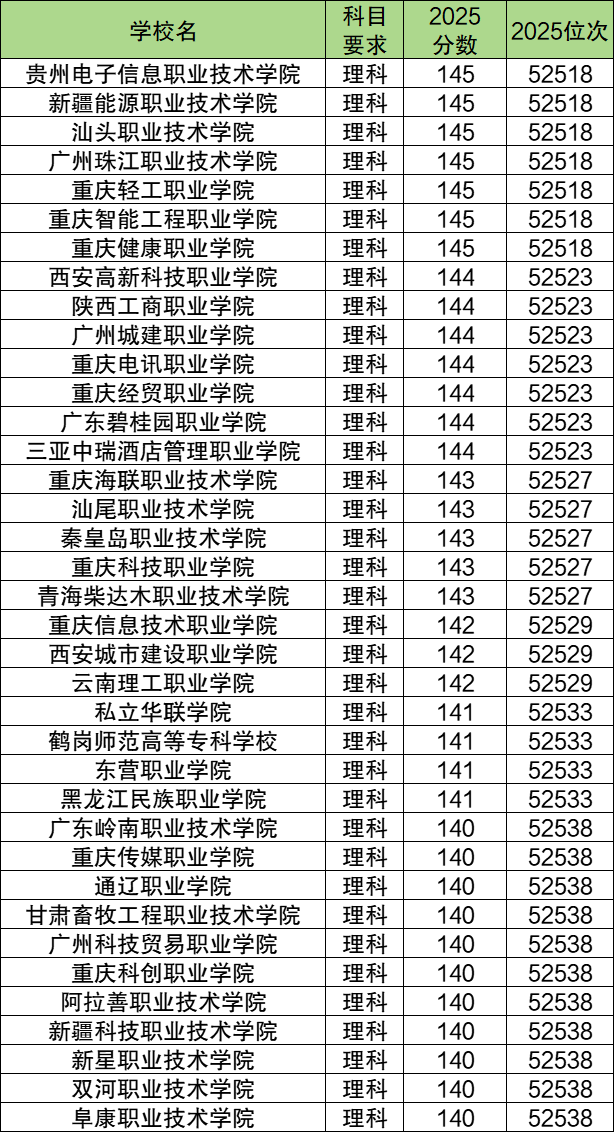 理科:高职(专科)批分数线为140分,对应位次是52538名。