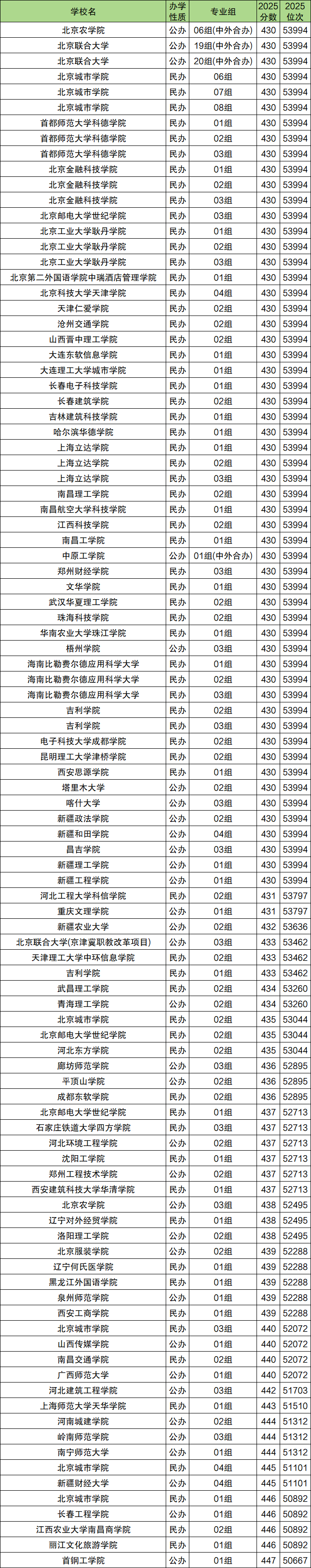 2025年分数线最低的100所本科学校录取线范围是430分到447分,对应位次从53994名到50667名,具体名单如下表所示(含33所公办):